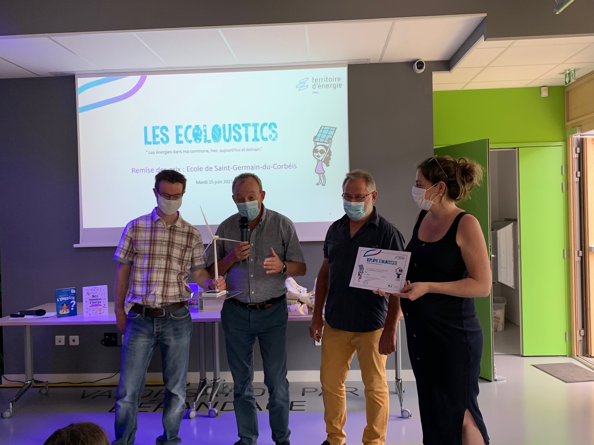 Le Président du Territoire d’Énergie Orne, Philippe Auvray, a décerné un trophée à l’ensemble de la classe et chaque élève a reçu deux livres sur le thème de l’énergie, un sablier de douche pour économiser l’eau à la maison et d’autres petits lots.