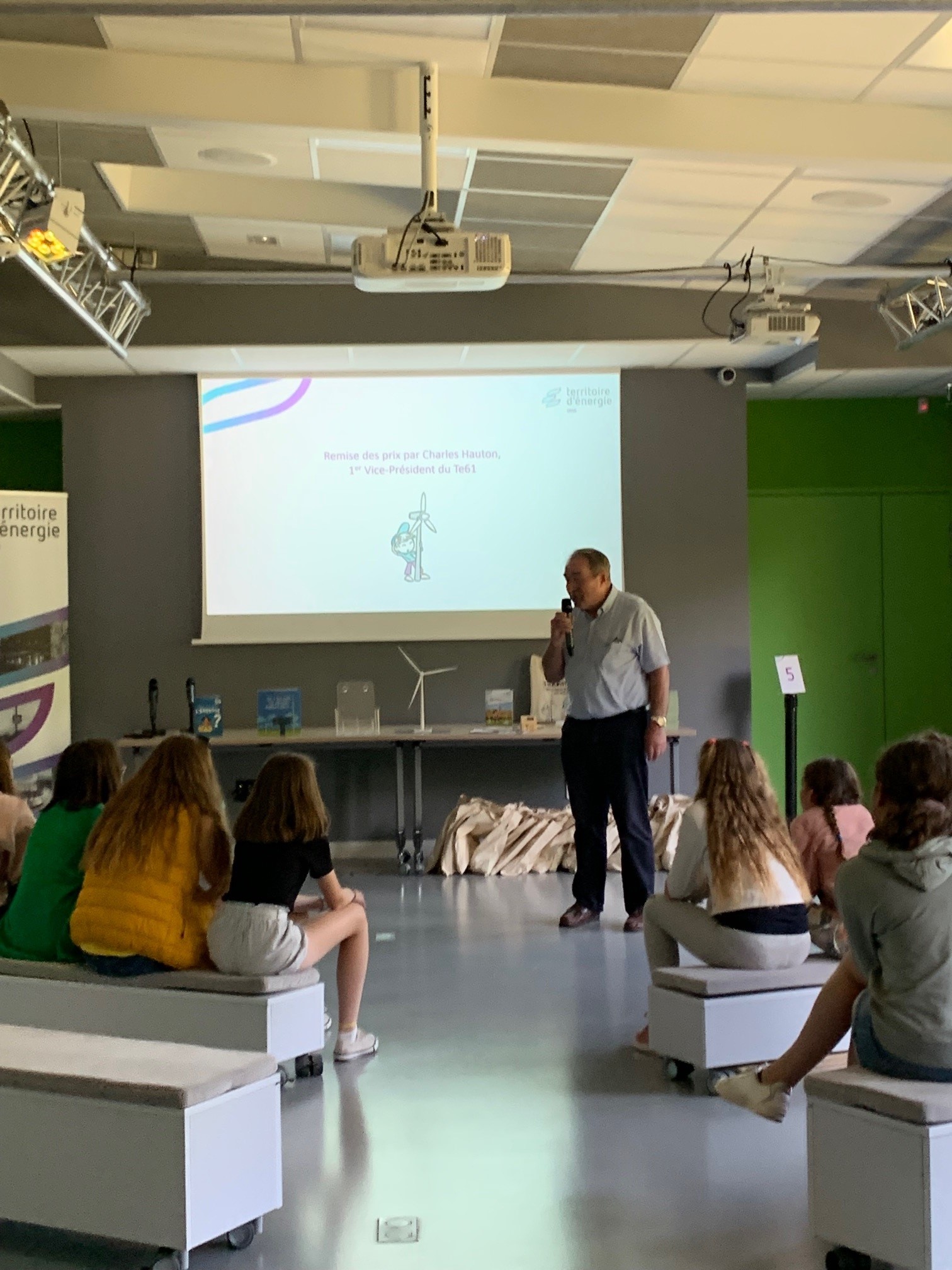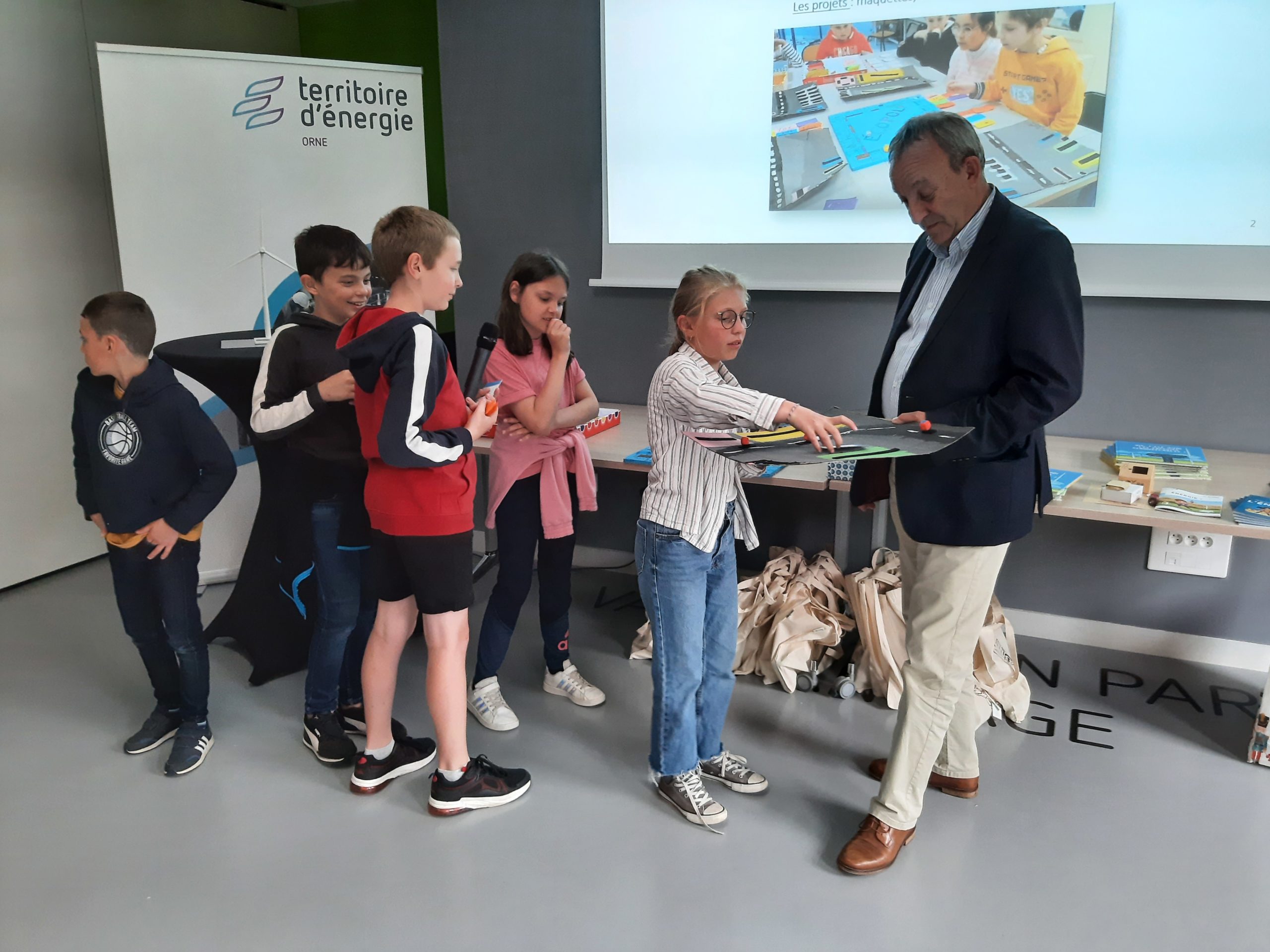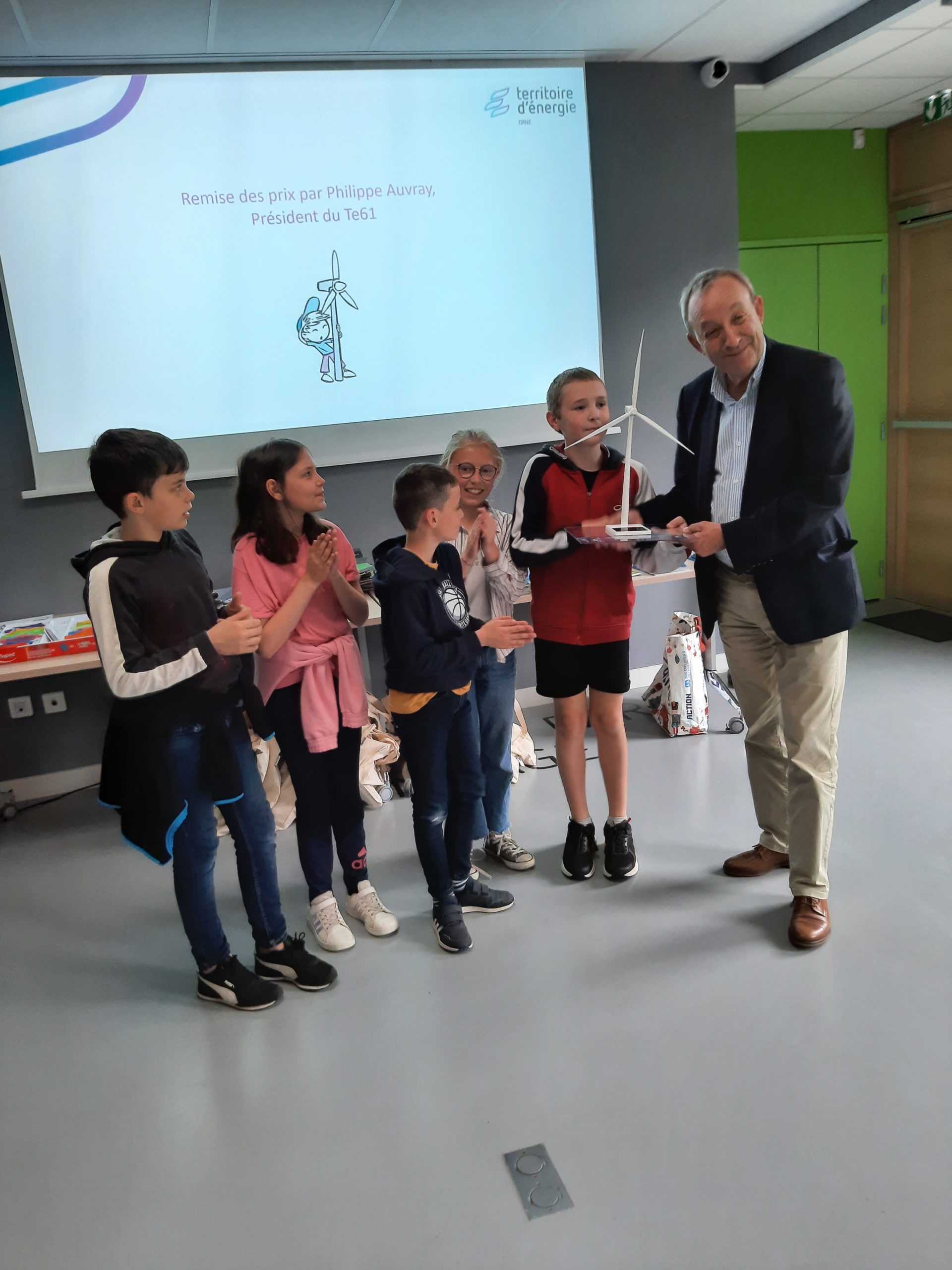 Le Président du Territoire d’Énergie Orne, Philippe Auvray, a décerné un trophée à l’ensemble de la classe et chaque élève a reçu deux livres sur le thème de l’énergie, un sablier de douche pour économiser l’eau à la maison et d’autres petits lots.