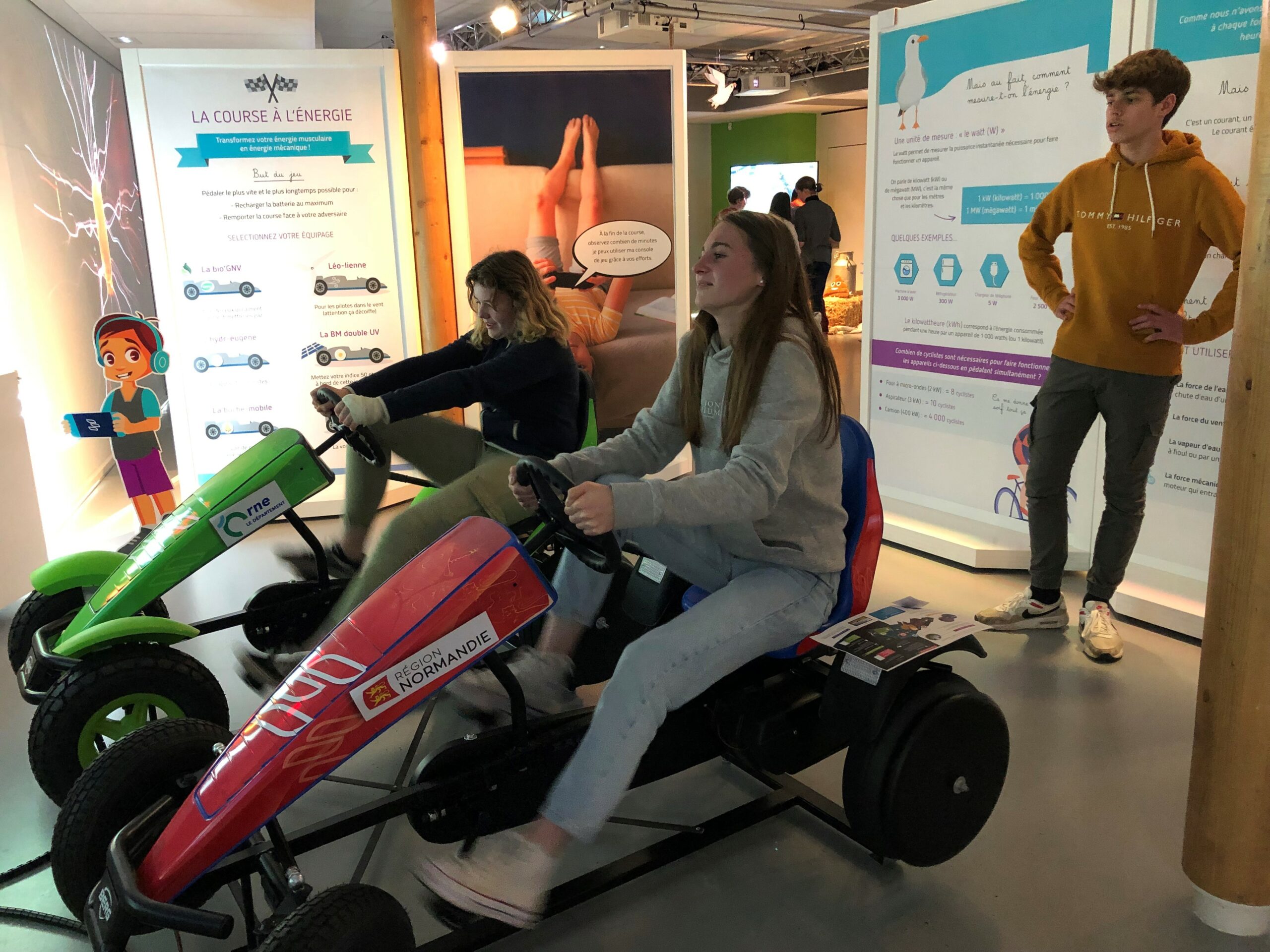 Cet espace atelier permet d’aborder des notions fondamentales pour définir l’énergie. Pour comprendre la production et la transformation de l’énergie, montez à bord de votre voiture de course et pédalez le plus vite possible !